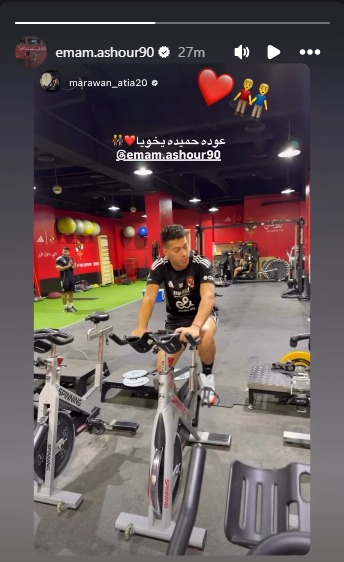 نشر مروان عطية، لاعب وسط الفريق الكروي الأول بالنادي الأهلي، مقطع فيديو عبر حسابه الشخصي على موقع "إنستجرام"، يظهر فيه زميله إمام عاشور داخل صالة الجيم بالتتش، أثناء خوضه البرنامج التأهيلي الخاص به استعدادًا للعودة إلى التدريبات الجماعية للفريق.