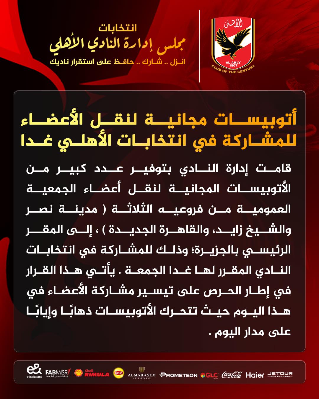 قامت إدارة النادي الأهلي بتوفير عدد كبير من الأتوبيسات المجانية لنقل أعضاء الجمعية العمومية من فروعه الثلاثة ( مدينة نصر والشيخ زايد، والقاهرة الجديدة )، إلى المقر الرئيسي بالجزيرة؛ وذلك للمشاركة في انتخابات النادي المقرر لها غدًا الجمعة.