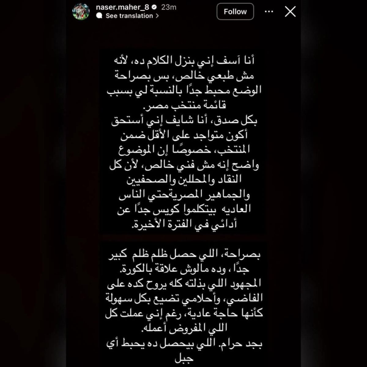 ونشر ناصر ماهر قصة عبر حسابه الرسمي على موقع "إنستجرام"، كتب فيها: “أنا آسف إني بنزل الكلام ده، لأنه مش طبعي خالص، بس بصراحة الوضع محبط جدًا بالنسبة لي بسبب قائمة منتخب مصر”.