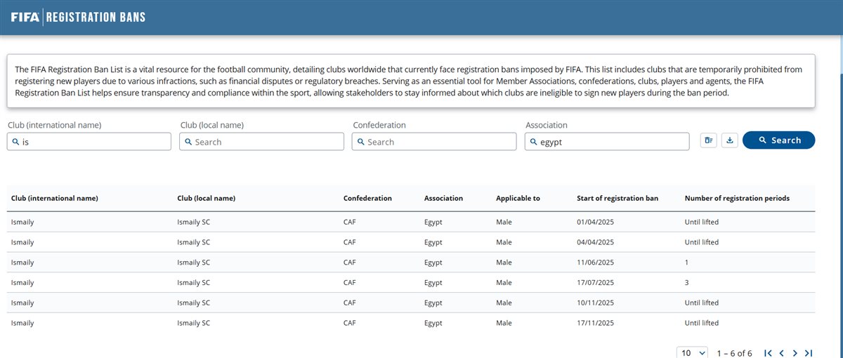 قضية سادسة.. فيفا يعلن إيقاف قيد جديد للإسماعيلي
