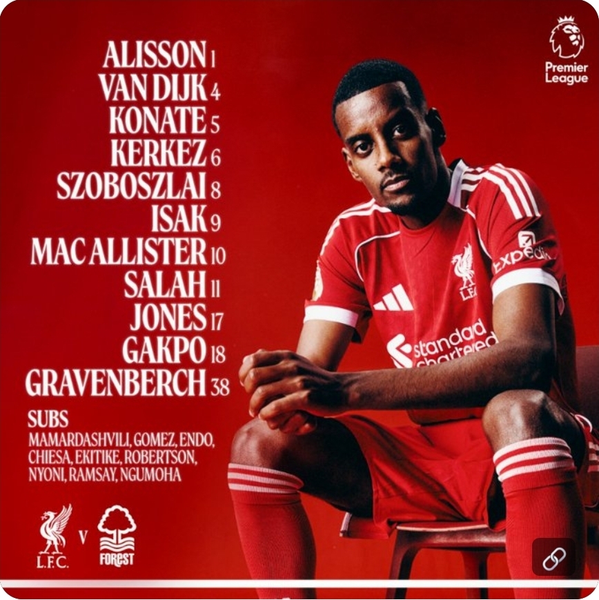 أعلن الهولندي أرني سلوت المدير الفني لفريق ليفربول ، تشكيل الريدز للمواجهة المرتقبة أمام نظيره نوتنجهام فورست، اليوم السبت، على ملعب أنفيلد، في الجولة الثانية عشرة من الدوري الإنجليزي الممتاز.