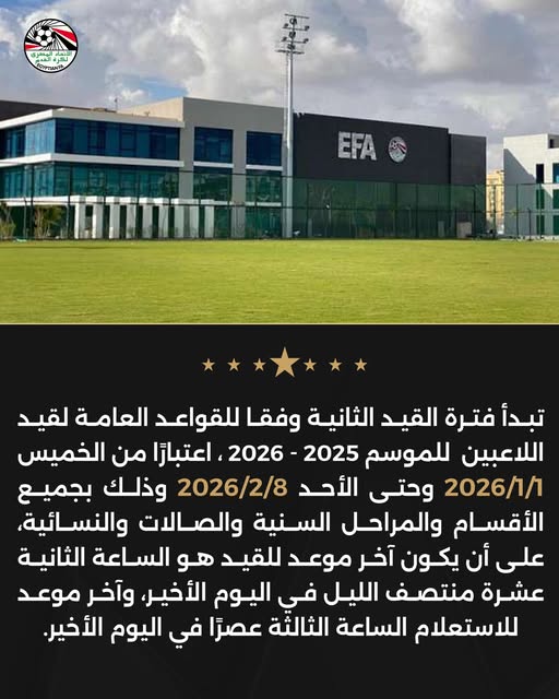 أعلن الاتحاد المصري لكرة القدم في بيانه، عن بدء فترة القيد الثانية للاعبين لموسم 2025-2026، اعتبارا من يوم الخميس 1 يناير 2026، وتستمر حتى الأحد 8 فبراير 2026، وذلك وفقا للقواعد العامة لقيد اللاعبين.