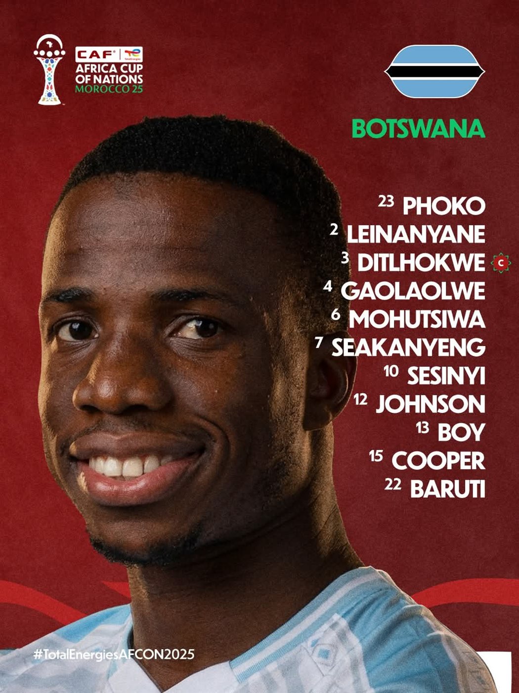 أعلن الجهازان الفنيان لمنتخبي بوتسوانا والكونغو الديمقراطية تشكيل الفريقين في مباراة اليوم ضمن منافسات كأس أمم إفريقيا 2025 بالمغرب حيث يبدأ منتخب بوتسوانا بكل من: فوكو، لينانياني، ديتلهوكوي (قائد الفريق)، غاولاولوي، موهوتسيفا، سيكانينج، سيسيني، جونسون، بوي، كوبر، وباروتي.