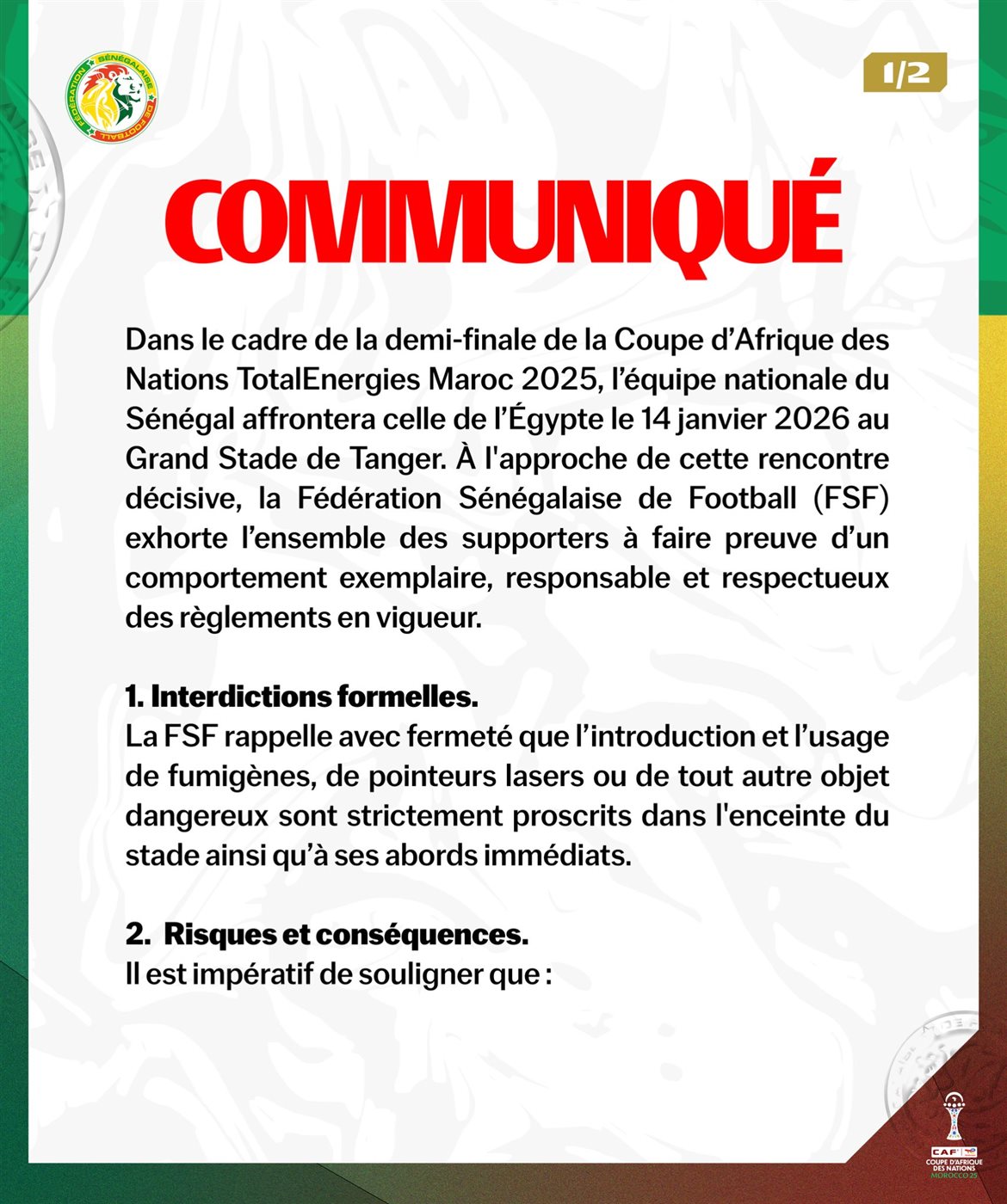 وفي ختام بيانه، وجه الاتحاد السنغالي نداءً لجماهيره بضرورة إظهار الروح الوطنية والمسؤولية، من أجل أن تظل مباراة نصف النهائي مناسبة رياضية تعكس القيم الحقيقية لكرة القدم الإفريقية، يسودها اللعب النظيف والأمن، مع دعم منتخب «أسود التيرانجا» بحماس وانضباط.