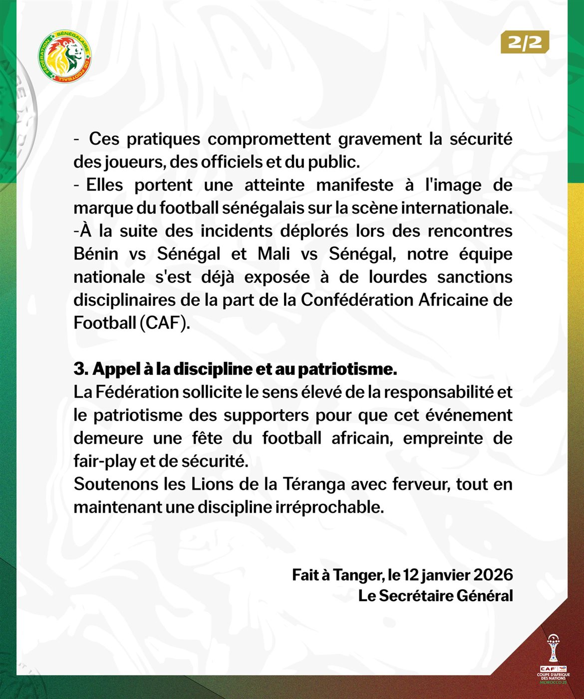 وأشار الاتحاد إلى أن مثل هذه السلوكيات تسيء إلى سمعة كرة القدم السنغالية على المستوى الدولي، لافتًا إلى أن المنتخب تعرض بالفعل لعقوبات تأديبية من الاتحاد الإفريقي لكرة القدم، على خلفية أحداث سابقة شهدتها مباراتا بنين ومالي أمام السنغال.