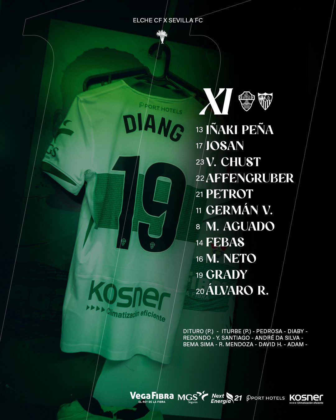 الدكة الاحتياطية: ديتورو، إيتوربي، بيدروسا، ديابي، ريدوندو، ي. سانتياغو، أندريه دا سيلفا، بيما سيما، ر. ميندوزا، ديفيد آدم.
