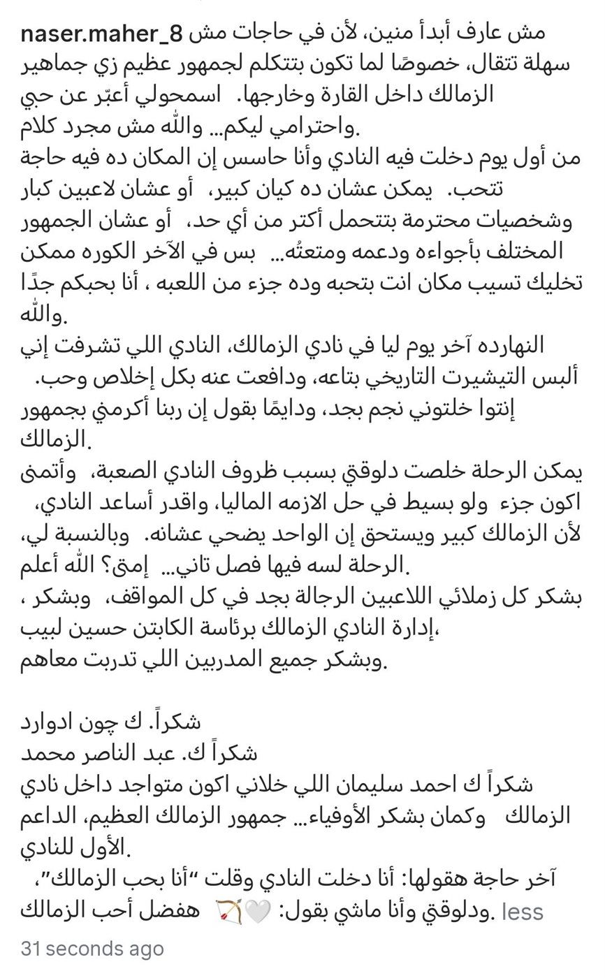 ونشر ناصر ماهر رسالة مطولة عبر حسابه الرسمي على موقع "إنستجرام"، عبر خلالها عن امتنانه الكبير لنادي الزمالك وجماهيره، مؤكدًا أن الحديث عن الرحيل لم يكن سهلًا، خاصة في ظل ما وصفه بعظمة جمهور القلعة البيضاء داخل مصر وخارجها.