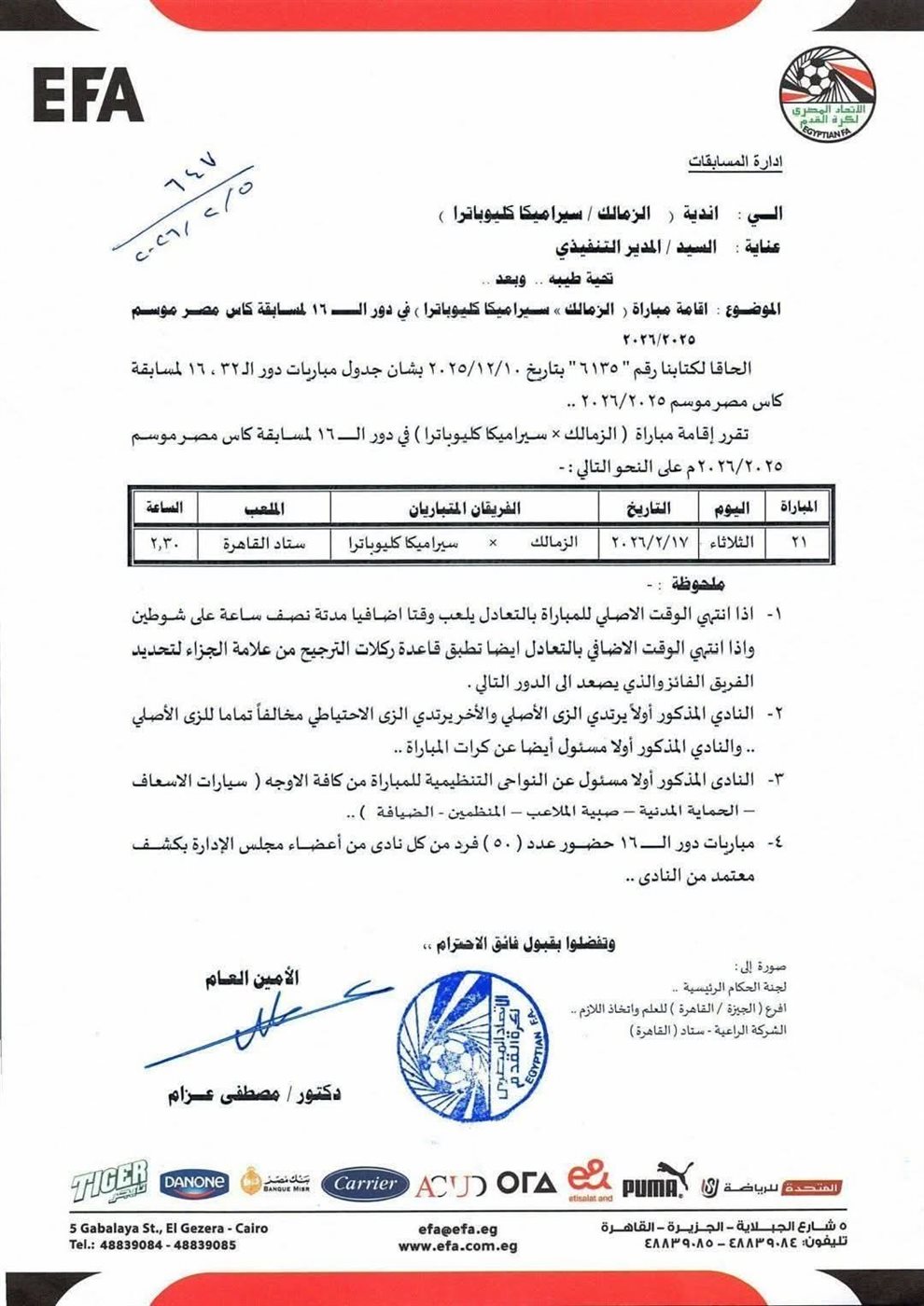 وكان مسؤولو نادي الزمالك أبدو دهشتهم من توقيت إعلان الاتحاد المصري لكرة القدم عن موعد مباراة الفريق الأول أمام سيراميكا كليوباترا، ضمن منافسات دور الـ16 من بطولة كأس مصر.