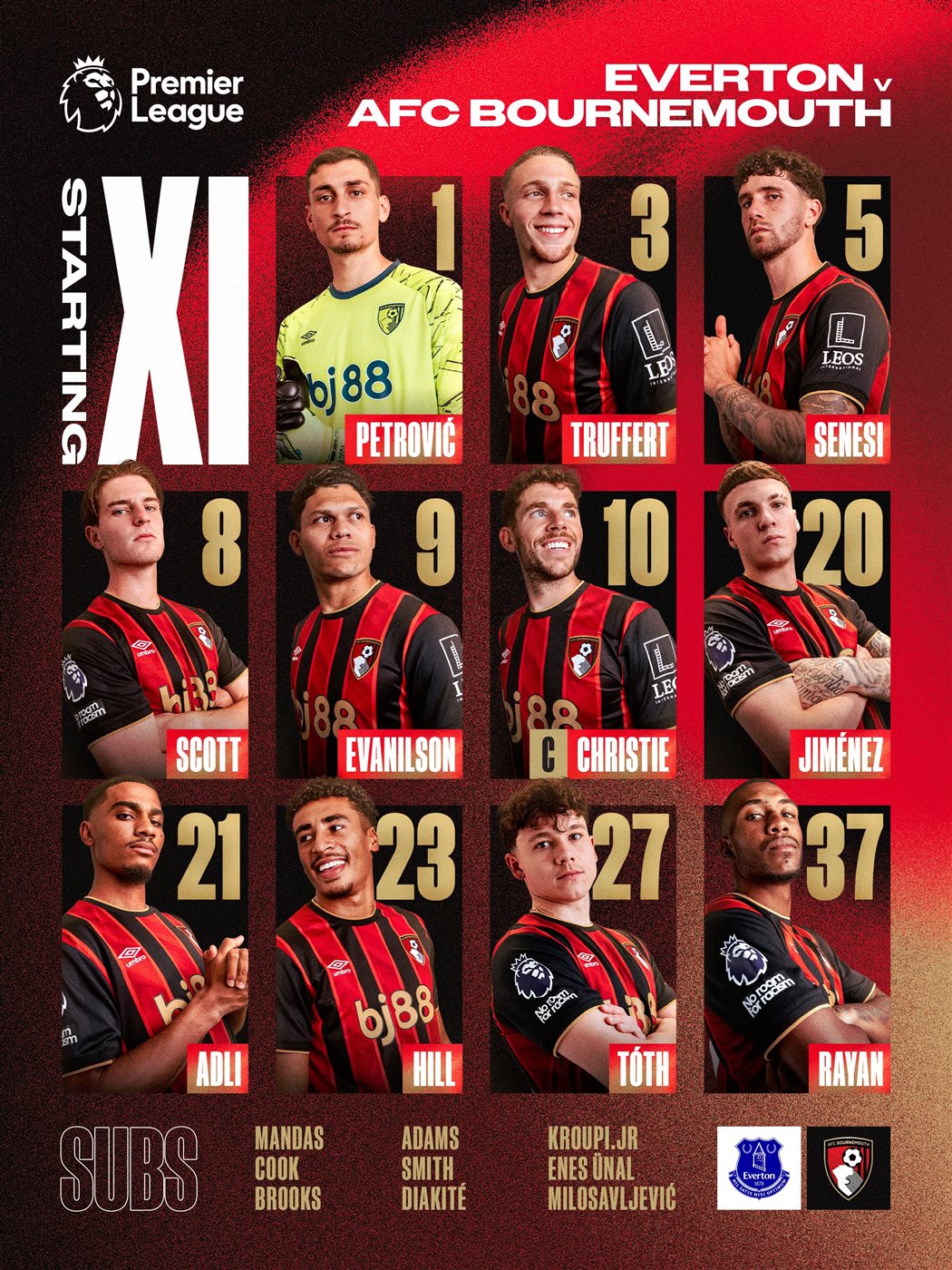 فيما بدأ بورنموث أمام إيفرتون بالتشكيل التالي: