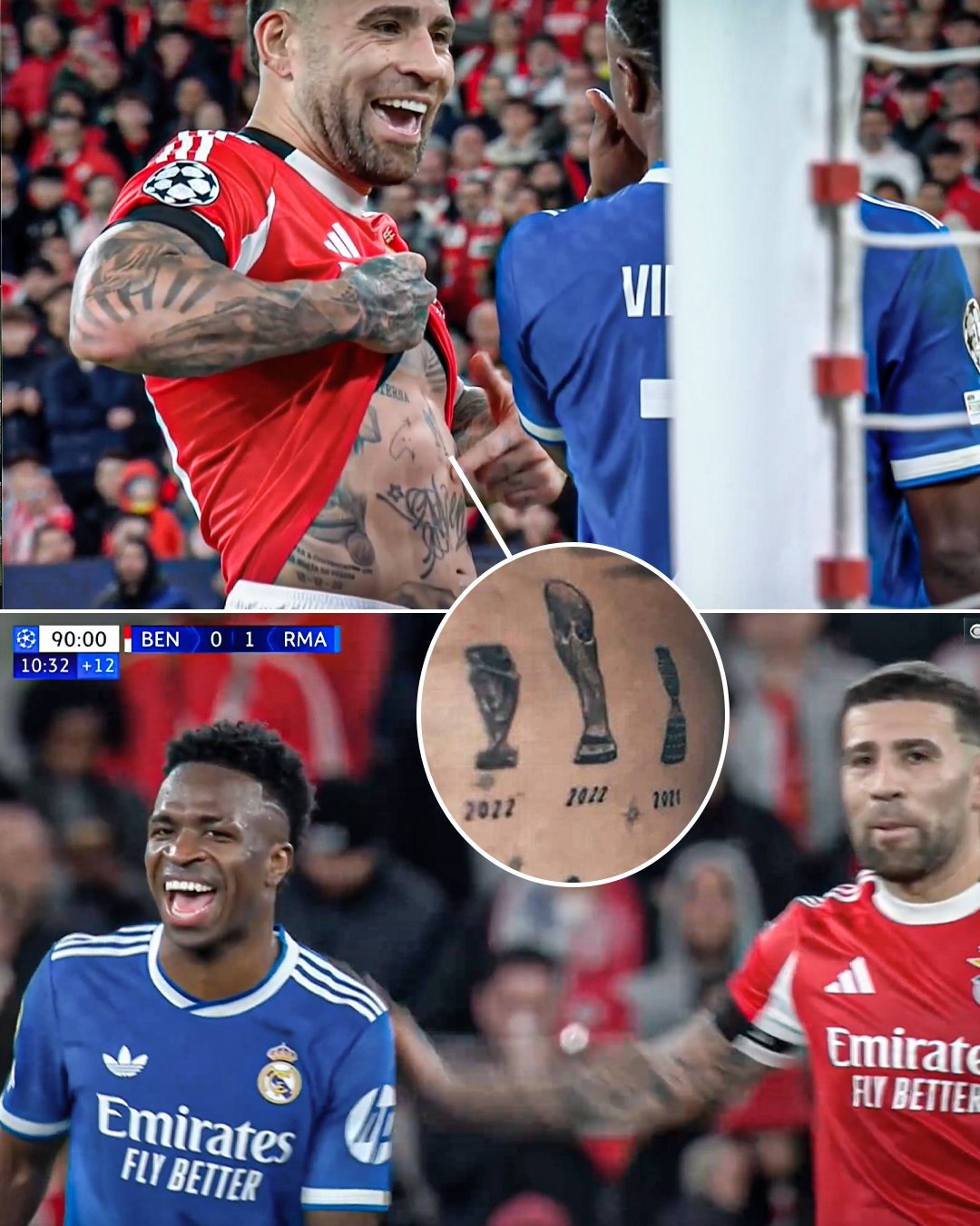 لم ينتهي الأمر عند هذا الحد، بل حاول الأرجنتيني الآخر نيكولاس أوتاميندي، مدافع بنفيكا، استفزاز البرازيلي فينيسيوس جونيور، بالكشف عن وشمًا على جسده يحمل الألقاب التي حققها رفقة منتخب الأرجنتين، وهي كأس العالم وكأس كوبا أمريكا، في محاولة لاستغلال العداء التاريخي بين البلدين.