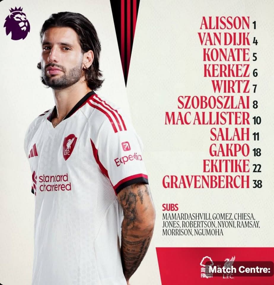 أعلن أرني سلوت المدير الفني لـ ليفربول، تشكيل فريقه لمواجهة نظيره نوتينجهام فورست، اليوم الأحد ضمن منافسات الدوري الإنجليزي الممتاز.