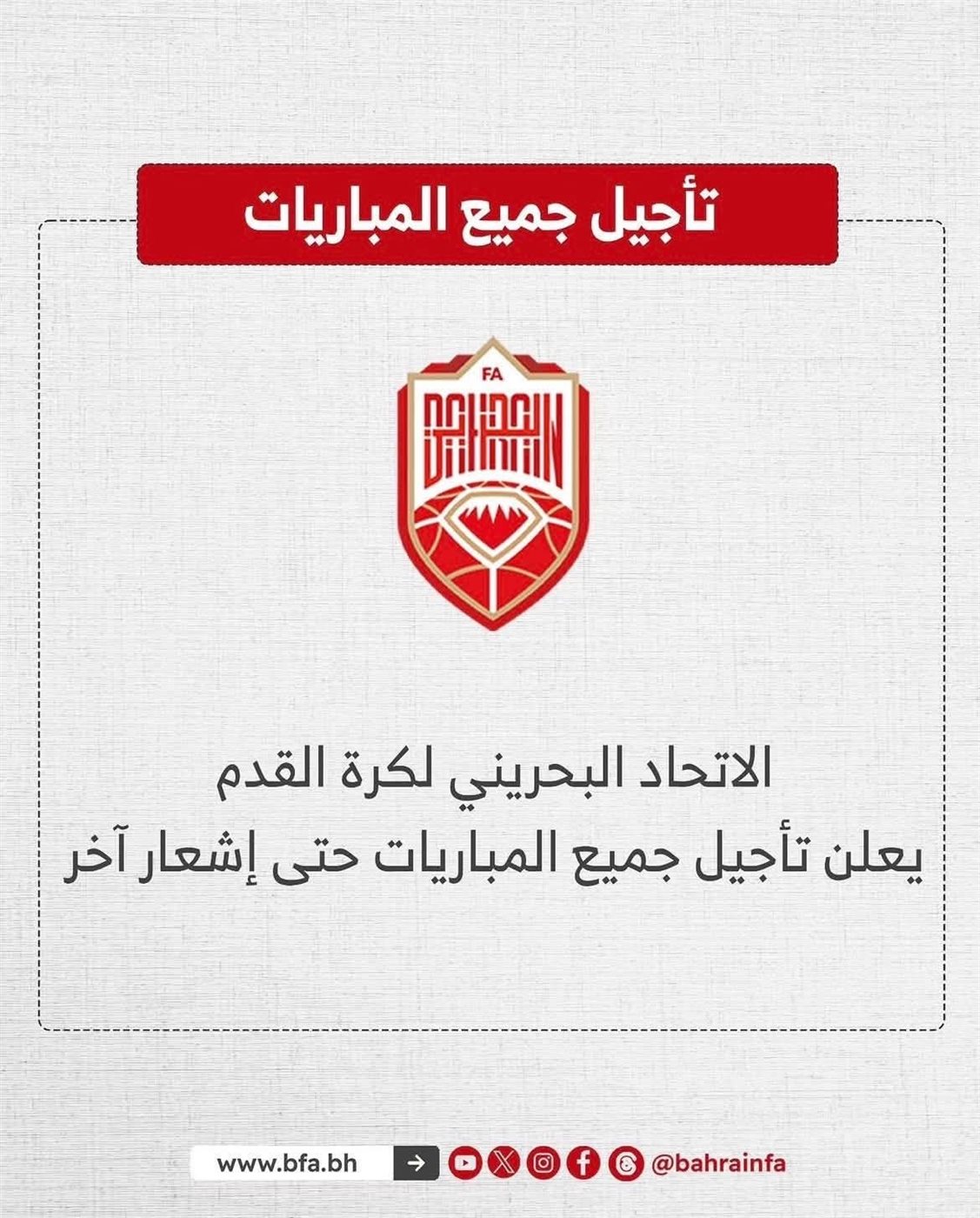 أعلن الاتحاد البحريني لكرة القدم عبر حسابه الرسمي على موقع التواصل الاجتماعي "إنستجرام" عن تأجيل جميع المباريات حتى إشعار آخر.