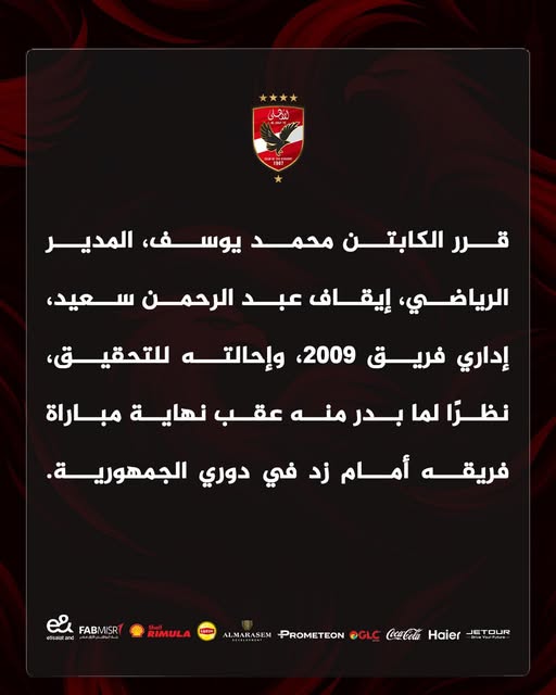 قرر محمد يوسف المدير الرياضي في النادي الأهلي إيقاف عبدالرحمن سعيد إداري فريق مواليد 2009 عن العمل، مع إحالته للتحقيق، على خلفية الأحداث التي شهدتها مباراة الفريق أمام زد إف سي.