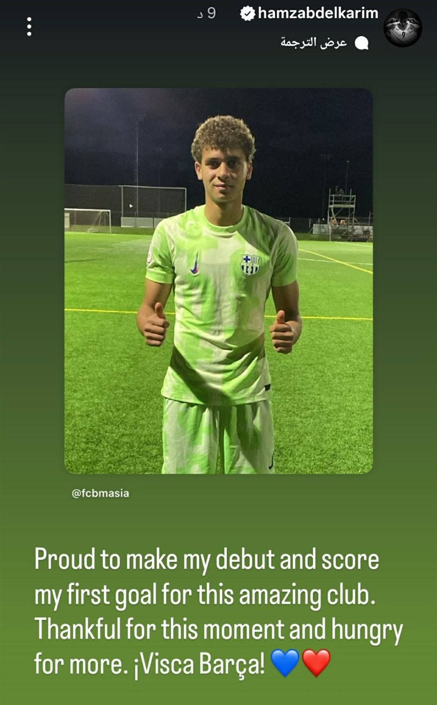 نشر اللاعب المصري الشاب حمزة عبد الكريم عبر حسابه الرسمي على إنستجرام أول تعليق له بعد تسجيل هدفه الأول مع فريق برشلونة للشباب في ظهوره الرسمي الأول بقميص الفريق الكتالوني.