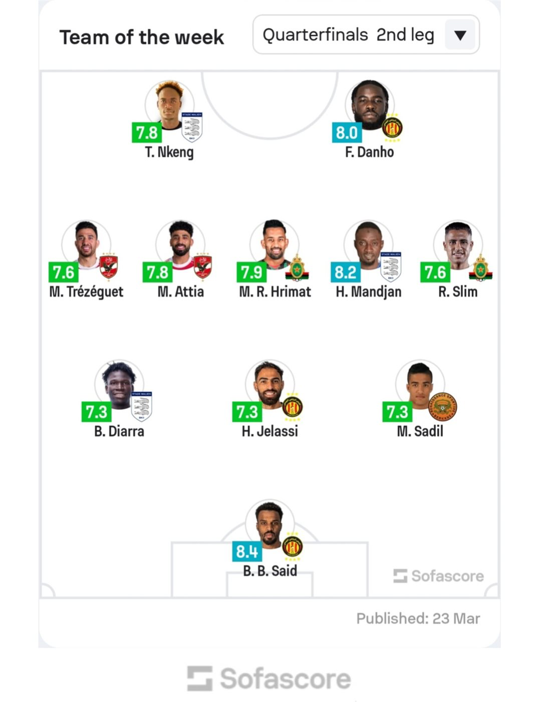 وحصل مروان عطية لاعب الأهلي على تقييم 7.8 وفقا لمنصة الإحصائيات «سوفا سكور»، فيما نال تريزيجيه تقييم 7.6، ليحجز الثنائي مكانهما ضمن الأفضل في هذه المرحلة من البطولة.