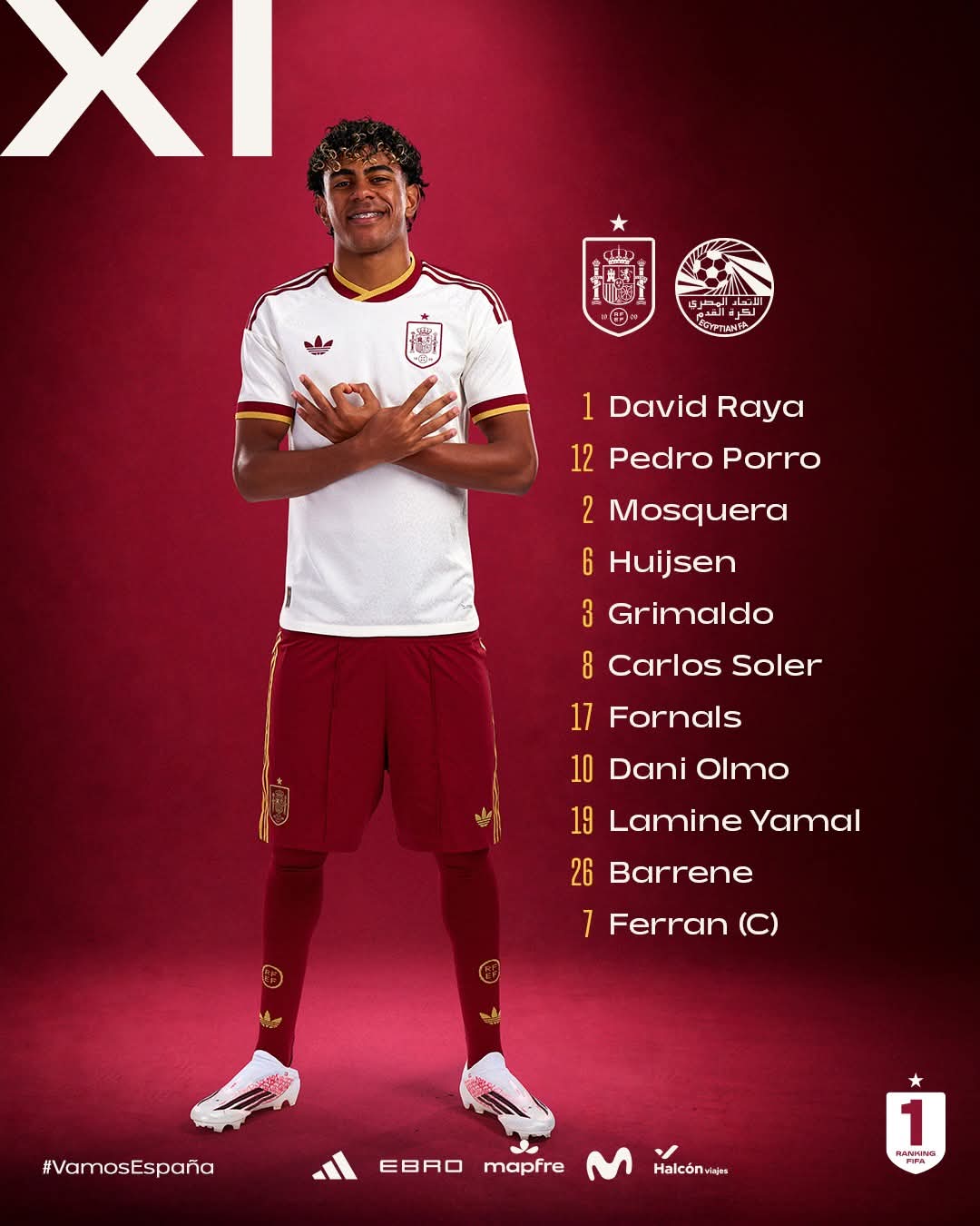 أعلن لويس دي لا فوينتي، المدير الفني لـ منتخب إسبانيا، تشكيل فريقه لمواجهة ضيفه منتخب مصر، في المباراة التي تجمعهما مساء اليوم في إطار استعدادات الفريقين لبطولة كأس العالم 2026.