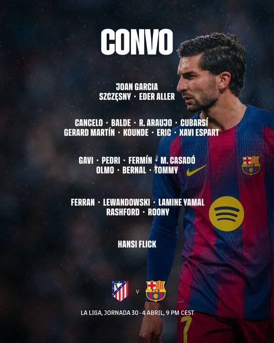 أعلن الألماني هانزي فليك، المدير الفني لفريق برشلونة، قائمة البلوجرانا لمواجهة أتلتيكو مدريد مساء اليوم السبت، على ملعب واندا متروبوليتانو، ضمن منافسات الجولة الثلاثين من الدوري الإسباني، والتي شهدت عودة الثنائي كوندي و بالدي.