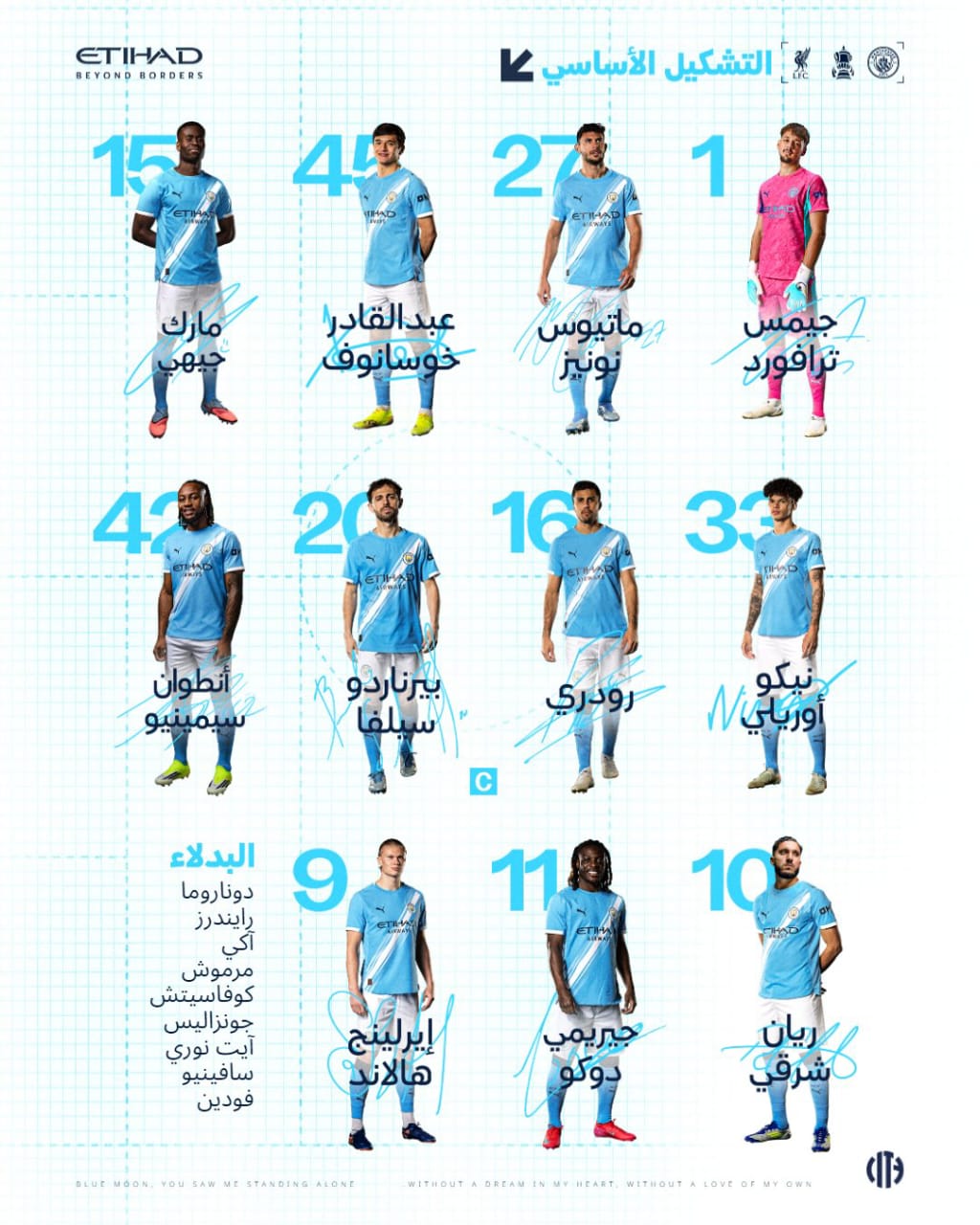 ويتواجد عمر مرموش على مقاعد بدلاء مانشستر سيتي، وجاء التشكيل الأساسي كالتالي: