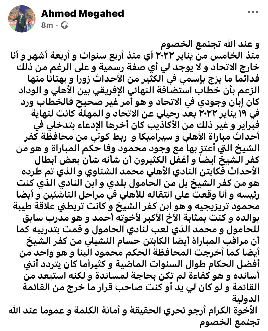وكتب مجاهد عبر حسابه الرسمي على “فيسبوك”، أنه منذ الخامس من يناير 2022، أي قبل أكثر من أربع سنوات، لم يعد له أي صفة داخل اتحاد الكرة، رغم تكرار ربط اسمه بعدة وقائع، مشددا على أن بعض هذه الاتهامات "زورا وبهتانا".