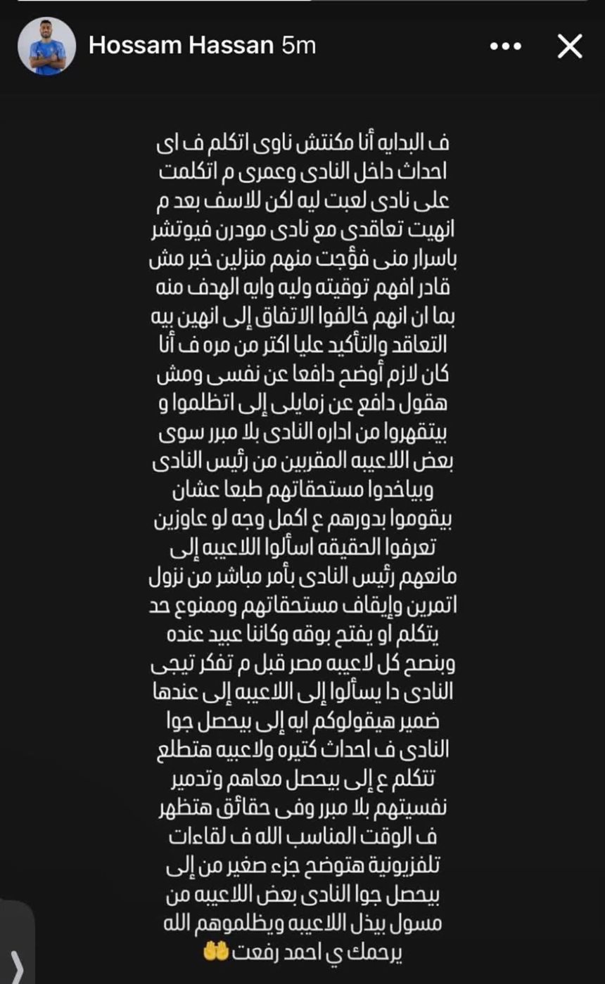 نشر حسام حسن، لاعب مودرن سبورت السابق، رسالة قوية بعد رحيله عن النادي، تحدث من خلالها عن المشاكل التي تعرض لها في النادي، والظلم الذي وصفه على حد تعبيره، وموجهًا النصيحة للاعبي الدوري المصري بالتفكير قبل الانضمام للنادي.