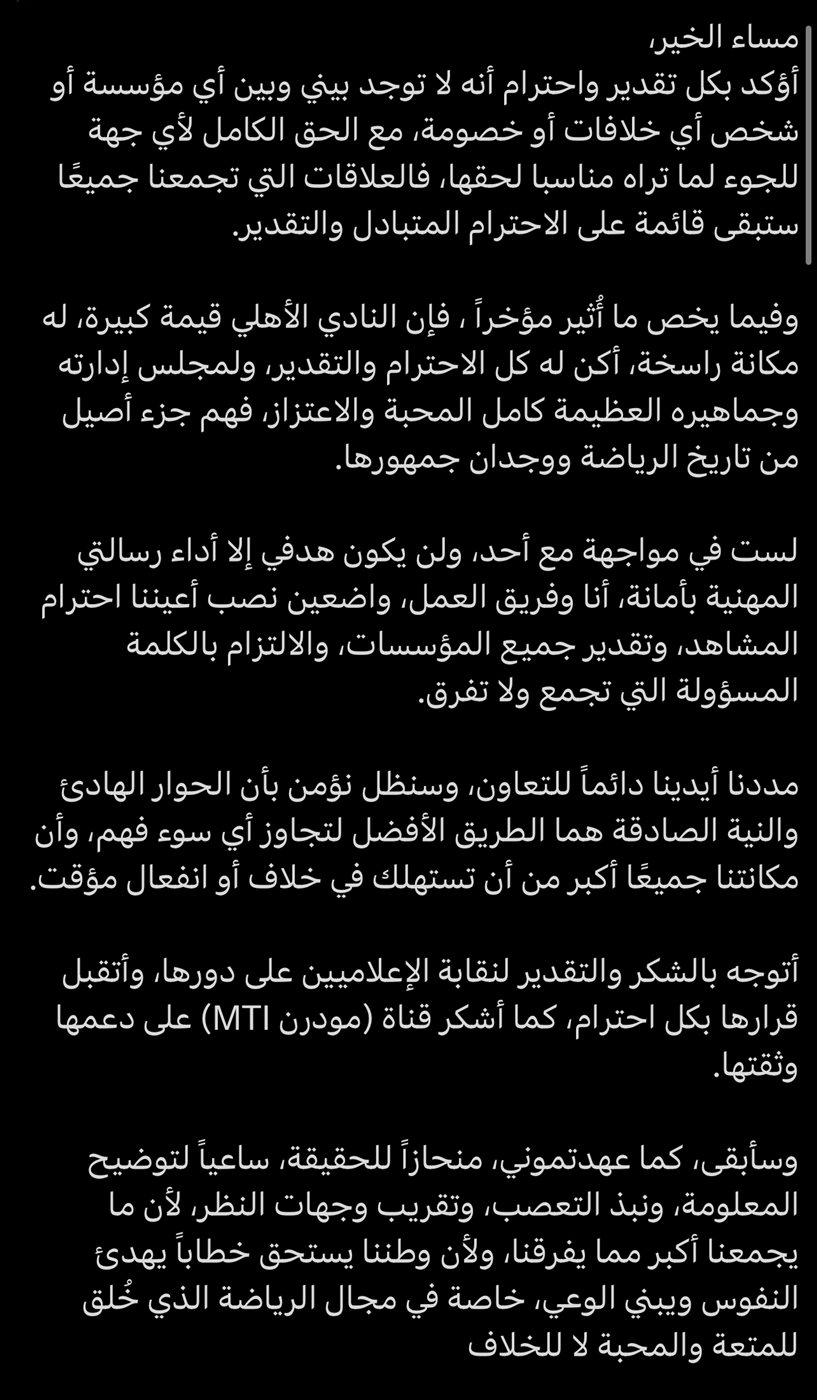 وأكد الإعلامي أنه ليس في مواجهة مع أي طرف، وأن هدفه يظل أداء رسالته المهنية بأمانة، مع فريق عمله، مع الالتزام باحترام المشاهد وتقدير المؤسسات كافة، والحرص على تقديم محتوى مهني مسؤول.