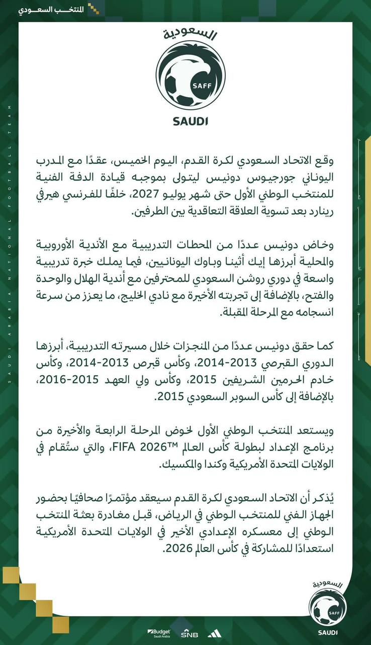 بيان الاتحاد السعودي عن تعيين جورجيوس دونيس