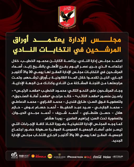 اعتمد مجلس إدارة النادي الأهلي، برئاسة الكابتن محمود الخطيب، خلال اجتماعه الذي عقد مساء اليوم، أسماء المرشحين لانتخابات مجلس الإدارة الجديد، الذين تقدموا خلال المدة القانونية بأوراق ترشحهم، وبعد مراجعتها من قبل اللجنة المشكله من النادي والجهة الإدارية.