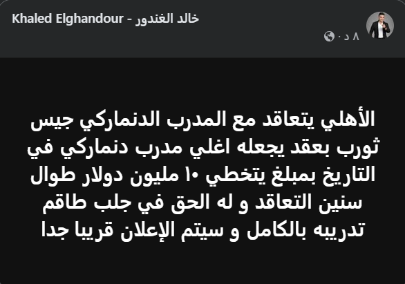 وكتب الغندور قائلا: الأهلي يتعاقد مع المدرب الدنماركي جيس ثورب بعقد يجعله اغلي مدرب دنماركي في التاريخ بمبلغ يتخطي 10 مليون دولار طوال سنين التعاقد و له الحق في جلب طاقم تدريبه بالكامل و سيتم الإعلان قريبا جدا.