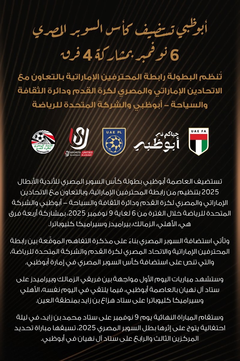 وتستضيف العاصمة أبوظبي بطولة كأس السوبر المصري للأندية الأبطال 2025 بتنظيم من رابطة المحترفين الإماراتية، وبالتعاون مع الاتحادين الإماراتي والمصري لكرة القدم، خلال الفترة من 6 إلى 9 نوفمبر 2025، بمشاركة أربعة فرق هي الأهلي، الزمالك، بيراميدز، وسيراميكا كليوباترا.