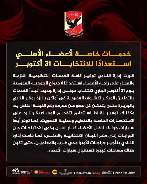 الأهلي يوفر خدمات خاصة لأعضاء النادي استعدادا للانتخابات 31 أكتوبر