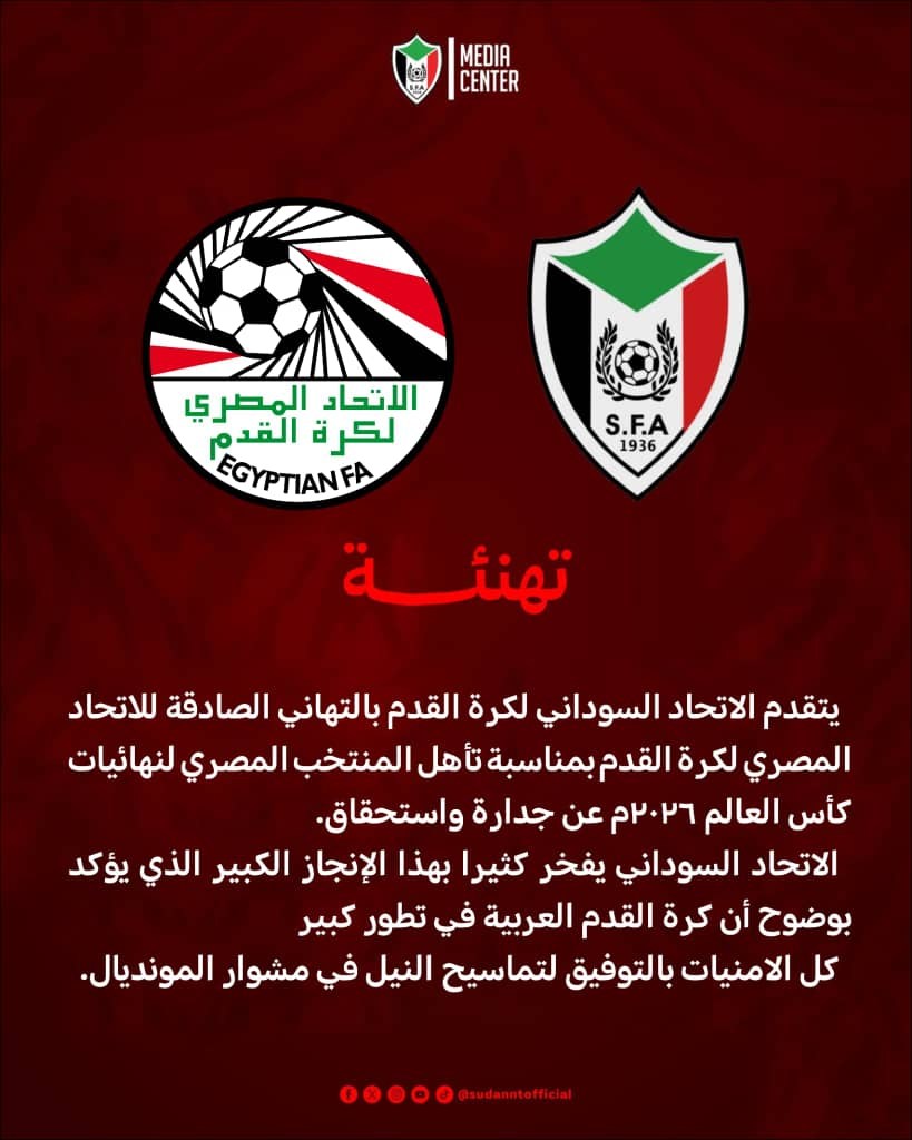 واختتم الاتحاد السوداني بيانه بتمنياته الخالصة للمنتخب المصري بمواصلة التألق وتحقيق نتائج مميزة في مشوار المونديال، متمنيًا تمثيلًا مشرفًا للكرة العربية في المحفل العالمي.