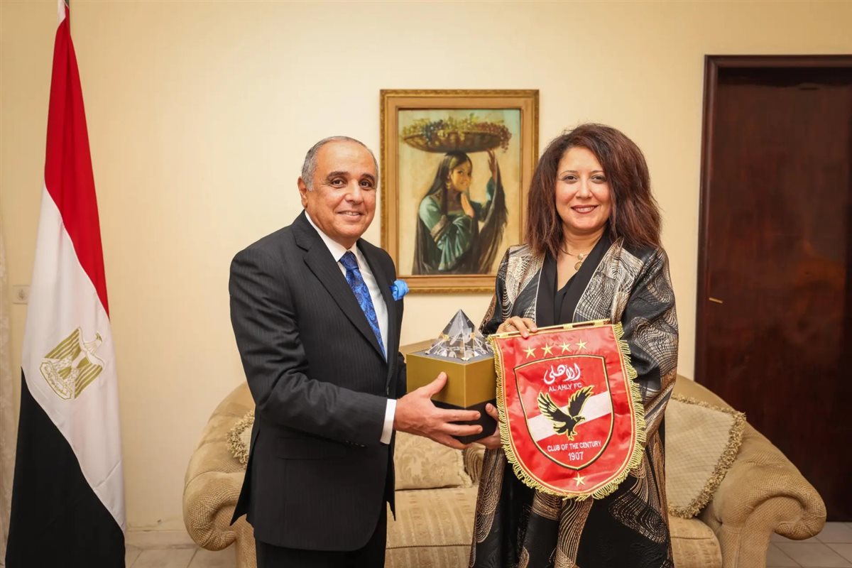 وفي ختام الزيارة، أهدى رئيس البعثة السفيرة درع وشعار النادي الأهلي تقديرًا لدعمها، كما أهدى عبد الحميد الرافعي الوزير المفوض درع الأهلي، قبل أن يلتقط الجميع الصور التذكارية تخليدًا لهذه المناسبة الودية.