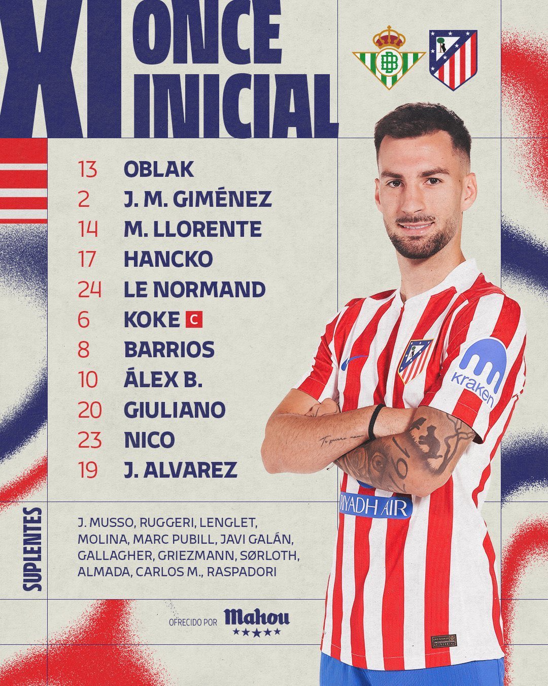 ودخل أتليتكو مدريد المبارة بتشكيل مكون من :- أوبلاك، خيمينيز، يورينتى، هانكو، لو نورماند، كوكى، باريوس، بايينا، جوليانو، نيكو، ألفاريز.